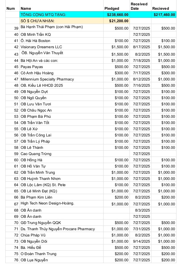 2- LM Nguyễn Thanh Châu, Chánh Xứ giáo xứ Philippe Phan Văn Minh, Orlando, tặng 500 Mỹ kim, Giáo Xứ thánh Philippe Phan Văn Minh tặng 5,000 MK