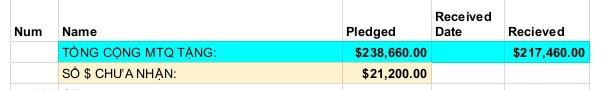 Tố Anh vừa nhận được ngân phiếu của LM Giuse Nguyễn Thanh Châu với tư cách cá nhân gởi tặng CĐ $500; Giáo Xứ Philiphe gửi tặng CĐ $5,000. Chân thành cám ơn LM Phan Thanh Châu và GX Thánh Philipe Phan Văn Minh.