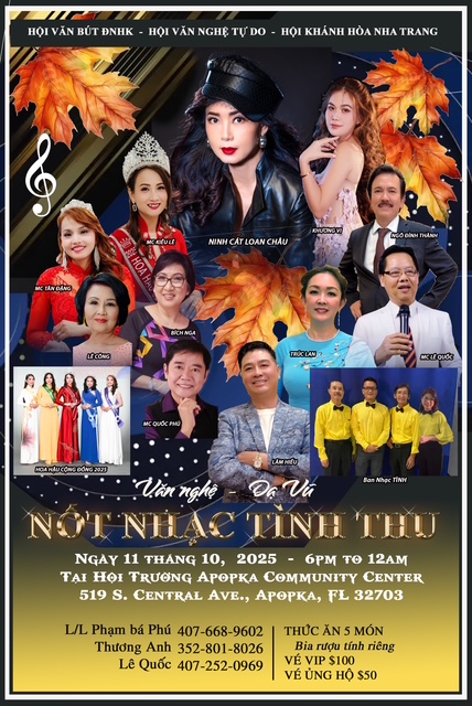 Trân trọng kính mời quý vị hưởng ứng tham dự ngày 11 tháng 10, 2025 do 3 Hội: Văn Bút ĐNHK, Hội Văn Nghệ TD và Hội Khánh Hòa-NhaTrang gây quỹ giúp Cộng Đồng TTFL mua Trụ Sở.